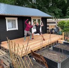 Der Bau Eines Holzdecks Auf Holzbalken Gelegt Hinterhof Terrasse Hintergarten Terrassenbelag
